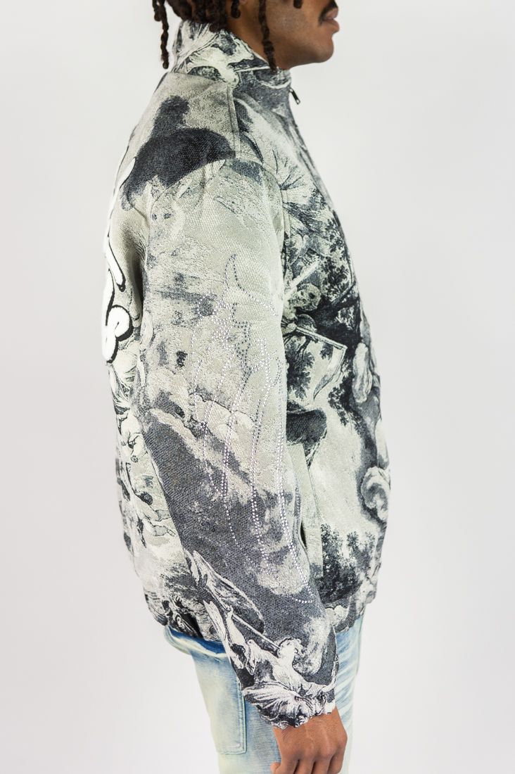 The Heavenly Script Tapestry Jacket blends timeless artwork with contemporary street style. Featuring an all-over woven tapestry design inspired by classical imagery, this jacket delivers depth, texture, and a luxury feel that sets it apart from standard outerwear.