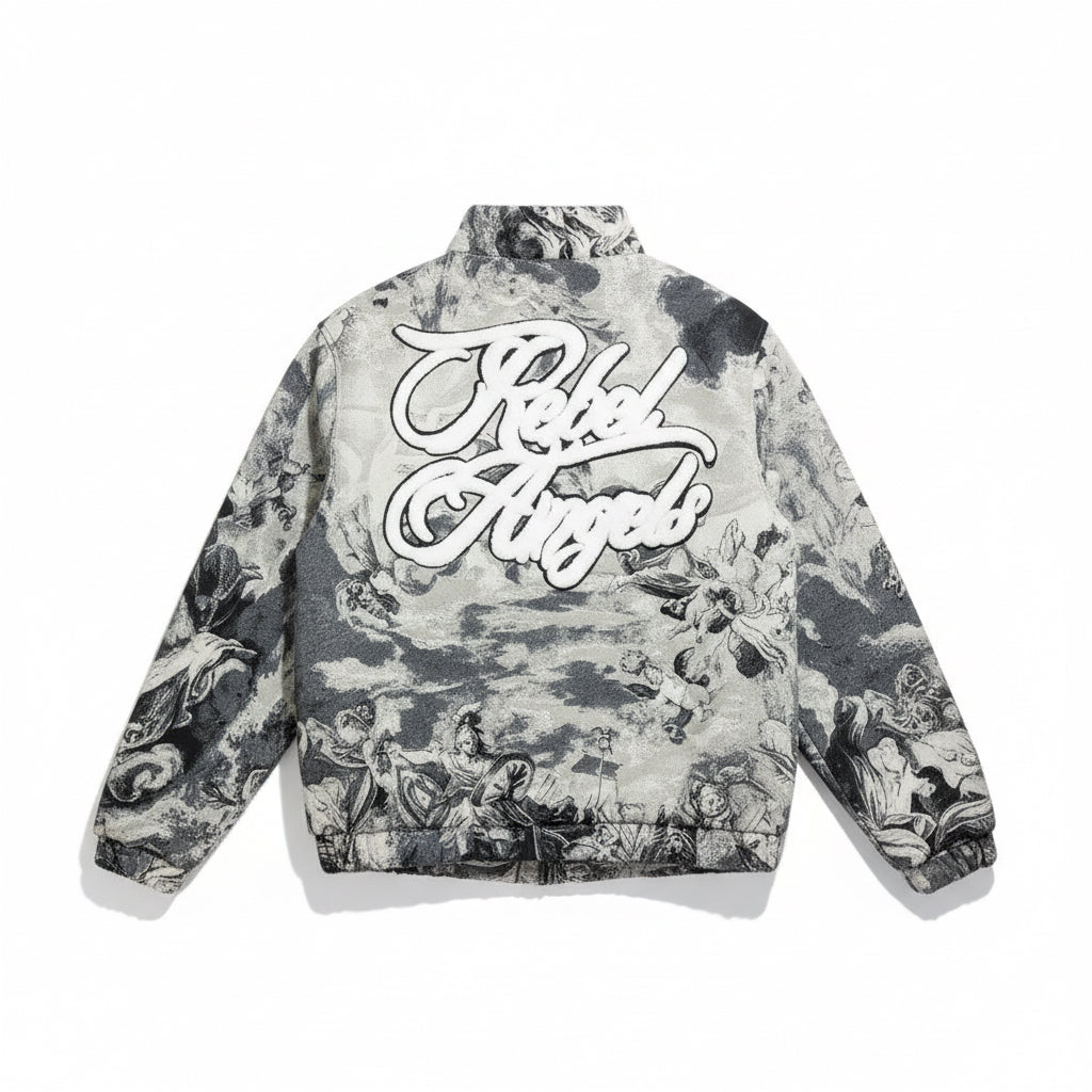 The Heavenly Script Tapestry Jacket blends timeless artwork with contemporary street style. Featuring an all-over woven tapestry design inspired by classical imagery, this jacket delivers depth, texture, and a luxury feel that sets it apart from standard outerwear.